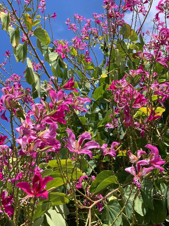 Fall in Hawaii is colorful with Hawaiian wiliwili, African tulip, Timor shower, rainbow shower and even the royal poinciana trees in late bloom. Also flowering now are several species of bauhinia, or orchid trees. One seldom seen here but common in cooler regions of South America is the silk floss tree, or Ceiba speciosa. This close relative of the kapok tree is rare here, but popular in Southern California. Some Hawaii nurseries will bring it in on request from California nurseries.