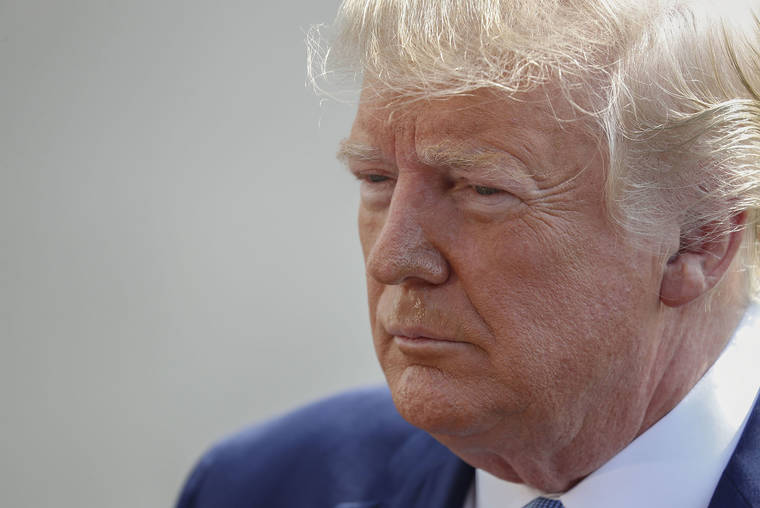 President Donald Trump pauses while speaking to the media on the South Lawn of the White House in Washington, Friday, Oct. 4, 2019, before his departure to nearby Walter Reed National Military Medical Center in Bethesda, Md. (AP Photo/Pablo Martinez Monsivais)