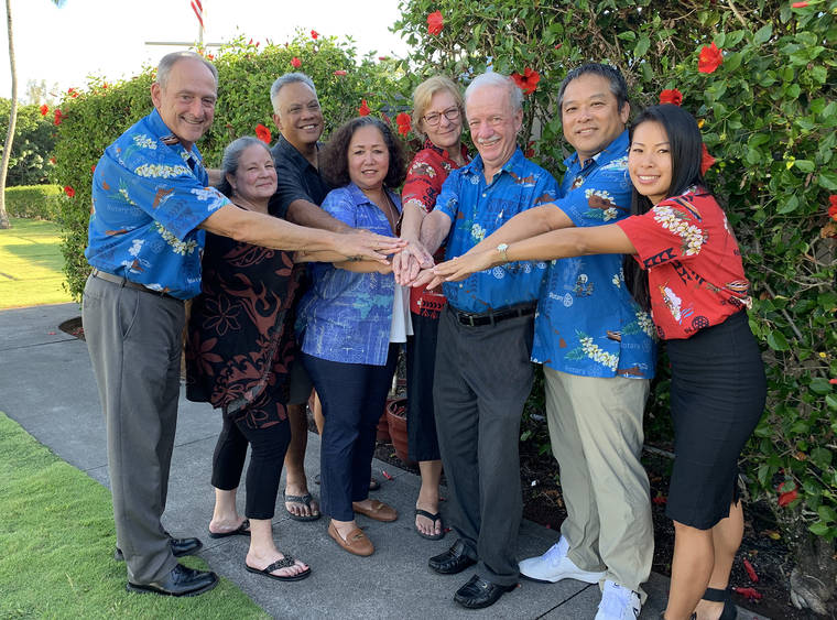 Courtesy photo Randy Hart, left, assistant Rotary district governor for East Hawaii, joins the other East Hawaii Rotary club presidents, who are supporting students this fall semester. Accompanying Hart are, from left, Lee Dombroski, Benson Medina, Margaret Stanley, Deb Nichols, Paul Field, Junichi Noumaru and Anna Liu.