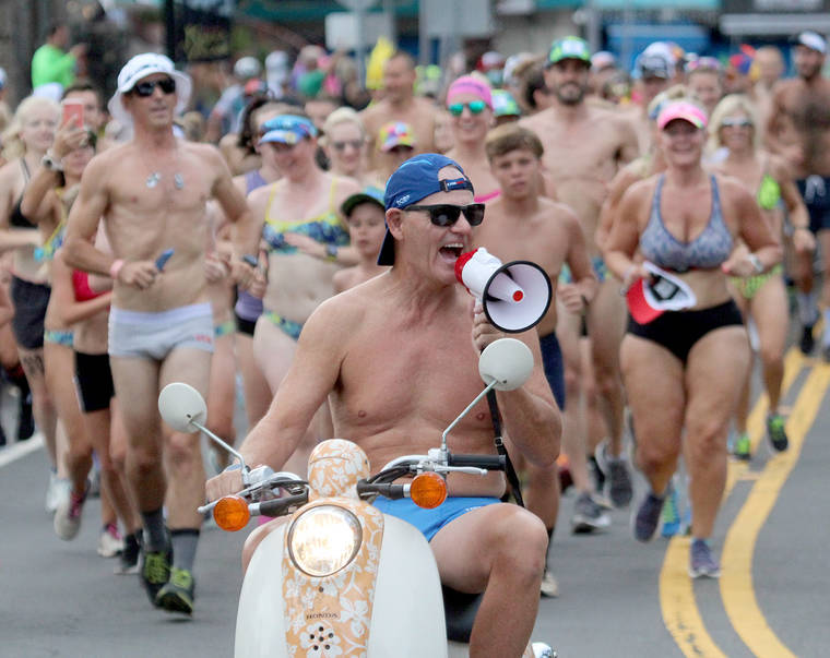 The less bashful, though, had no problem. Dressed in costumes or barely anything at all, they ran down Kailua-Kona’s famous waterfront strip in the name of good fun.