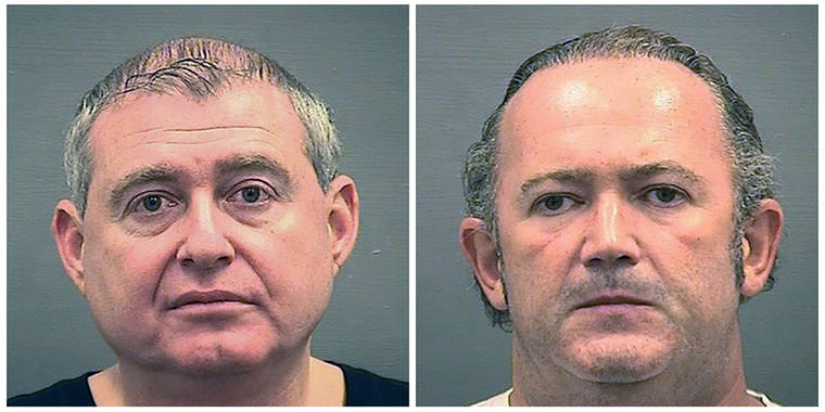This combination of photos provided by the Alexandria Sheriff’s Office shows booking photos of Lev Parnas, left, and Igor Fruman. (Alexandria Sheriff's Office via AP)