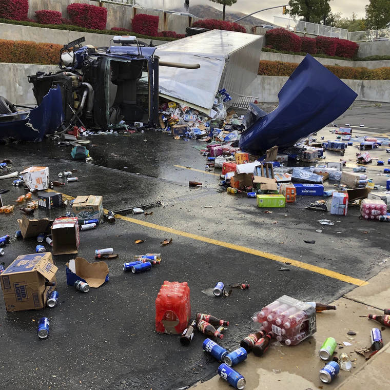 Sandy Police Stg. Jason Nielsen said the semitrailer veered and fell from a road and into the church’s parking lot after it was hit by a pickup truck that ran a red light. Beer cans were strewn across the empty church parking lot Thursday.