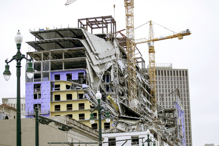 NEW ORLEANS — A large section of a Hard Rock Hotel under construction at the edge of New Orleans’ historic French Quarter collapsed Saturday amid blinding dust and flying debris, killing one person, injuring more than 20 and leaving two unaccounted as rescue workers hastened to enter what was left of the largely unstable building.