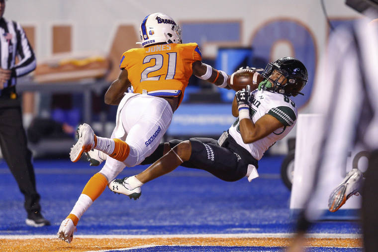 Associated Press Hawaii wide receiver Lincoln Victor pulls in a touchdown reception against Boise State defensive back Tyreque Jones during the first half Saturday.