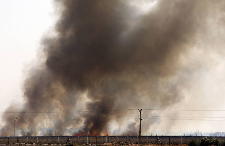 In this photo taken from the Turkish side of the border between Turkey and Syria, in Akcakale, Sanliurfa province, southeastern Turkey, smoke billows from fires on targets in Tel Abyad, Syria, caused by bombardment by Turkish forces, Sunday, Oct. 13, 2019. The United Nations says at least 130,000 people have been displaced by the fighting in northeastern Syria with many more likely on the move as a Turkish offensive in the area enters its fifth day. (AP Photo/Lefteris Pitarakis)
