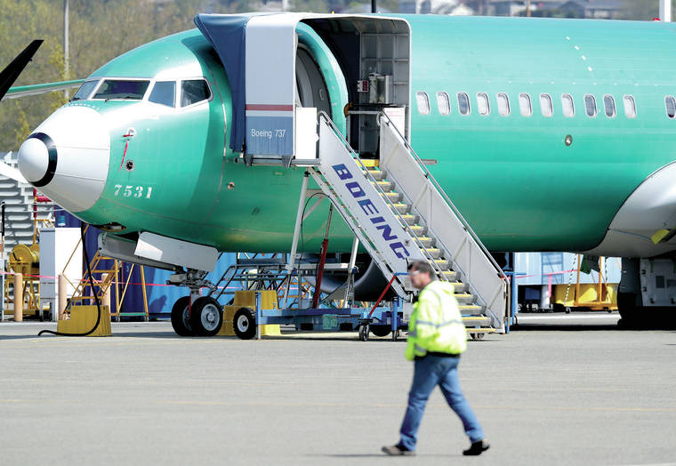 FILE - In this April 26, 2019, file photo a worker walks past a Boeing 737 MAX 8 airplane being built for Oman Air at Boeing’s assembly facility in Renton, Wash. Passengers who refuse to fly on a Boeing Max won’t be entitled to compensation if they cancel. However, travel experts think airlines will be very flexible in rebooking passengers of giving them refunds if they’re afraid to fly on a plane that has crashed twice. (AP Photo/Ted S. Warren, File)