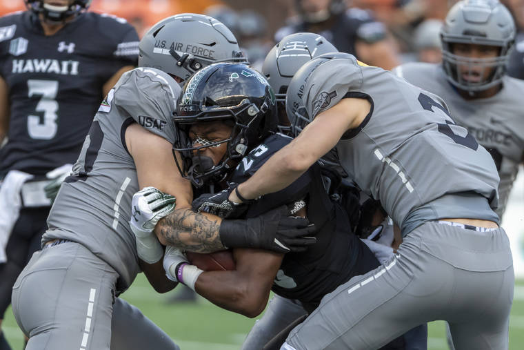 Associated Press Hawaii wide receiver Jared Smart is gang=tackled by a host of Air Force defenders during the first half Saturday night.