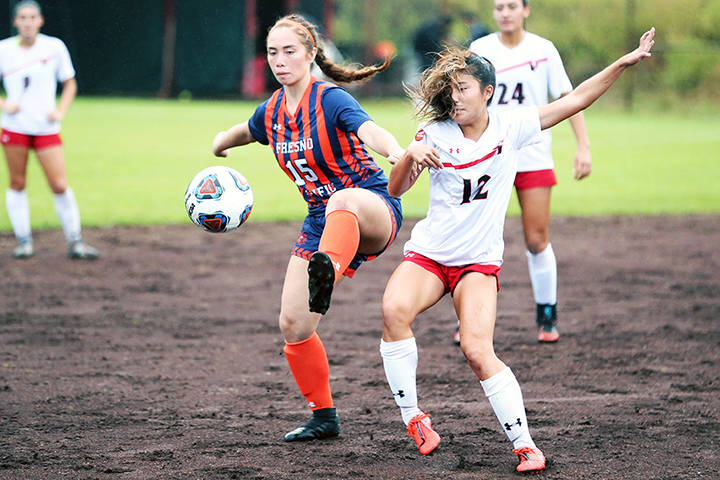 SAMANTHA DEVIVO/UHH UH-Hilo’s Brende Yoshizumi, right, and Fresno Pacific’s Hoku Ishikawa battle for possession Saturday at the Vulcans’ baseball field. The Vuls won 2-0.