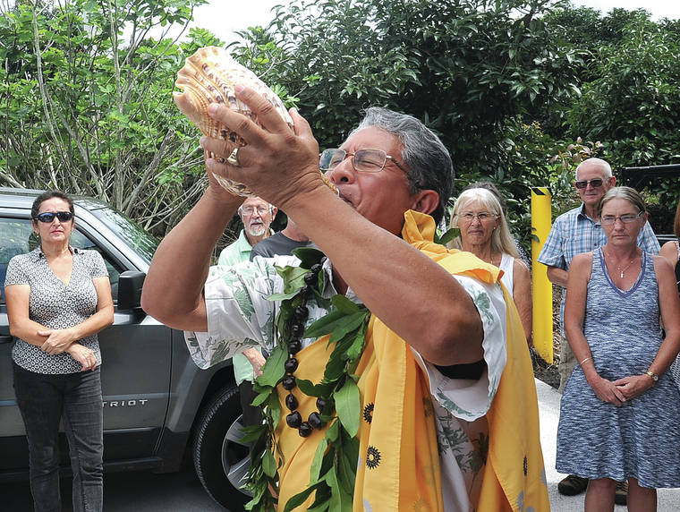Kahu Danny Akaka blows the pu, starting a traditional Hawaiian blessing at Avoland in South Kona on Saturday. (Laura Ruminski/West Hawaii Today)