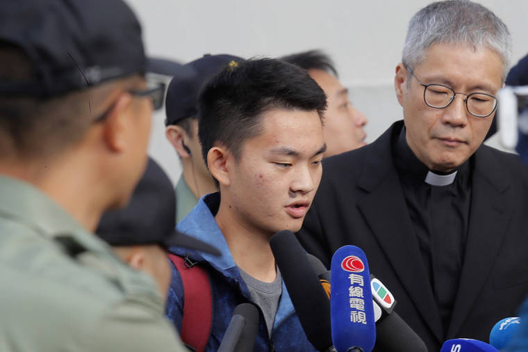 Chan Tong-kai, center, talks to the media as he is released from prison in Hong Kong Wednesday, Oct. 23, 2019. Chan, who's wanted for killing his girlfriend last year on the self-ruled island, had asked the Hong Kong government for help turning himself in to Taiwan after his sentence for money laundering offenses ends on Wednesday. (AP Photo/Kin Cheung)