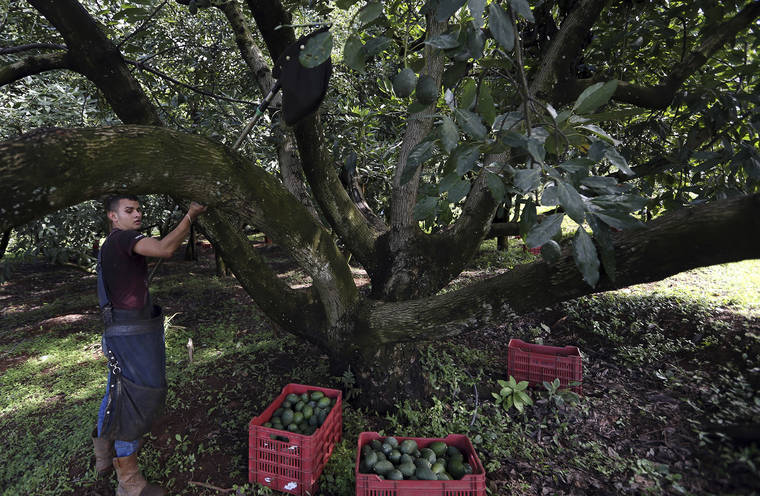 In this Oct. 1, 2019 photo, a farmhand harvests avocados at an orchard, near Ziracuaretiro, Michoacan state, Mexico. Avocado pickers earn an attractive wage for the region but the work is seasonal and so physically demanding that few can continue working beyond the age of 45. (AP Photo/Marco Ugarte)