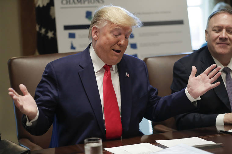 President Donald Trump gestures while speaking during a Cabinet meeting in the Cabinet Room of the White House, Monday, Oct. 21, 2019, in Washington. Sitting on the right is Secretary of State Mike Pompeo. (AP Photo/Pablo Martinez Monsivais)