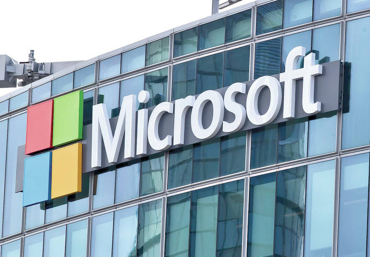 FILE - This April 12, 2016 file photo shows the Microsoft logo in Issy-les-Moulineaux, outside Paris, France. The Pentagon has awarded Microsoft a $10 billion cloud computing contract called JEDI, Friday, Oct. 25, 2019. The contentious bidding process for the contract pitted Microsoft, Amazon and Oracle, among others, against one another. (AP Photo/Michel Euler, File)