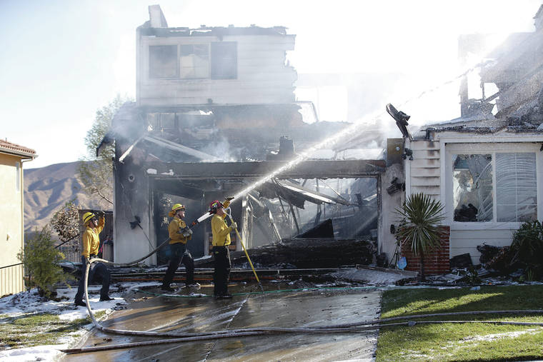 Firefighters try to put out a residence fire caused by a wildfire Friday in Santa Clarita, Calif. (AP Photo/Marcio Jose Sanchez)