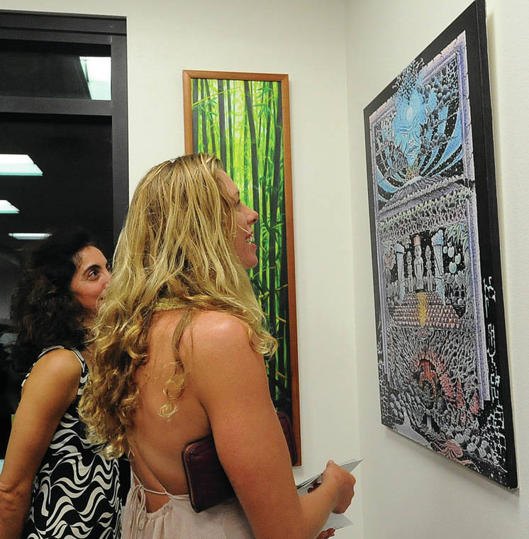 Corin Kelly looks at the artwork for sale at the Art is Healing Exhibition at the Kealakehe West Hawaii Community Health Center Friday evening. (Laura Ruminski/West Hawaii Today)