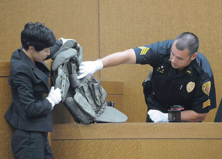 LAURA RUMINSKI/West Hawaii Today Sgt. Brian Tina on Tuesday during the trial for three people accused of being accomplices of Justin Waiki, who shot and killed Officer Bronson Kaliloa in July 2018, shows Deputy Prosecuting Attorney Kauanoe Jackson where a bullet entered his vest, striking him in the chest.