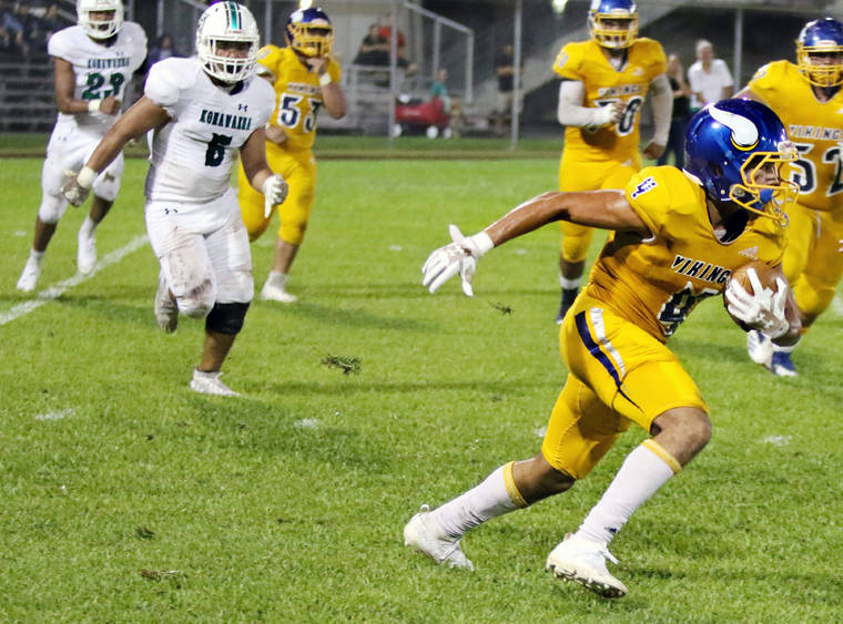 TIM WRIGHT/Tribune-Herald Hilo's Guyson Ogata broke away from the Konawaena defense for three touchdowns Saturday night as the Vikings won their seventh consecutive BIIF championship, 42-18.