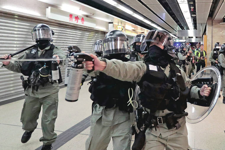As protesters chanted slogans at the New Town Plaza shopping mall in Sha Tin, police said they moved in after some “masked rioters” with fire extinguishers vandalized turnstiles and smashed windows at the subway station linked to the mall.