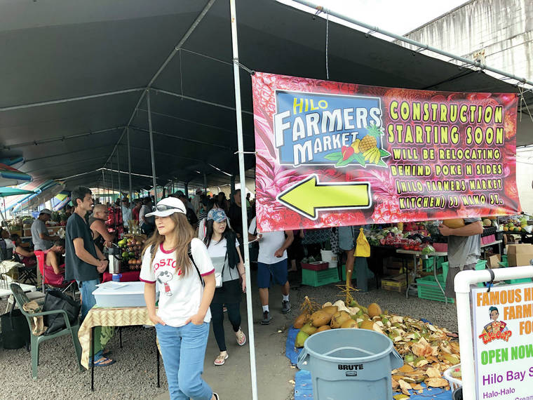 While the actual building of a permanent canopy over Hilo Farmers Market’s produce area hasn’t yet started, a sign was posted saying construction will start soon.