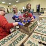 From left, Lakeshore Middle School students Tanner Hall, 12; Keeli Frank, 11; Brianna Vanco, 11; and Avery Forrester, 13, sort through boxes of donated potatoes as part of Turkey Tote Away on Thursday at Woodland Shores Baptist Church in Bridgman, Mich. The annual project provides Thanksgiving holiday meals for those in need.