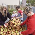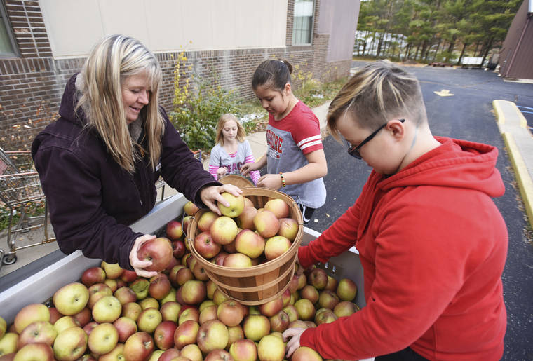 Suzanne Forraht, with The Shafer Farm LLC, helps Keeli Frank, 11; Brianna Vanco, 11; and Tanner Hall, 12, unload 20 bushels of donated apples as part of Turkey Tote Away on Thursday at Woodland Shores Baptist Church in Bridgman, Mich.