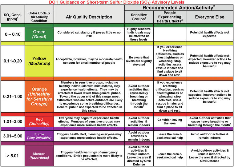 Hawaii Short Term SO2 Advisory data can be viewed by selecting “SO2 Advisory” from the “Current Air Quality” tab. Unlike the main webpage, which provides average hourly concentrations, the “SO2 Advisory” page provides 15-minute SO2 average concentrations in ppm and displays corresponding color-coded advisory levels based on specific DOH guidance for short-term SO2 exposure. The DOH guidance uses the same six-tiered color-coded structure and contains recommended actions for different groups according to SO2 concentration levels — summarized in the table graphic that accompanies this week’s “Volcano Watch.”