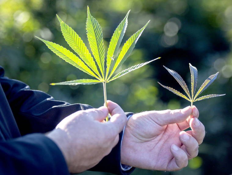 A farmer shows cannabis leaves to point out the varied hemp crops he grows in rural Whitewater, Wis. (Angela Major/The Janesville Gazette via AP)