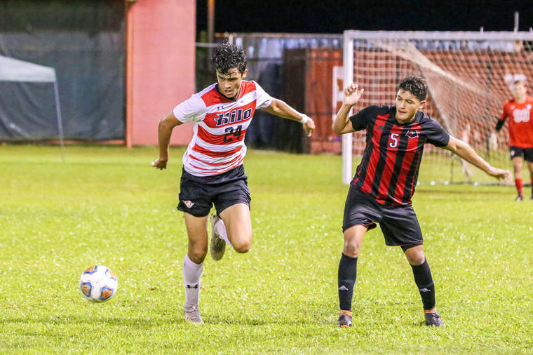 Jorge Martinez started his final week of college soccer off in style Monday night, scoring two goals as UH-Hilo’s men’s soccer team trumped Holy Names 2-0 at the Vulcans’ field.
