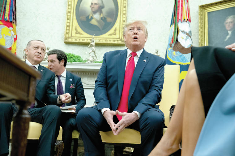 President Donald Trump speaks during a meeting with Turkish President Recep Tayyip Erdogan in the Oval Office of the White House, Wednesday, Nov. 13, 2019, in Washington. (AP Photo/ Evan Vucci)