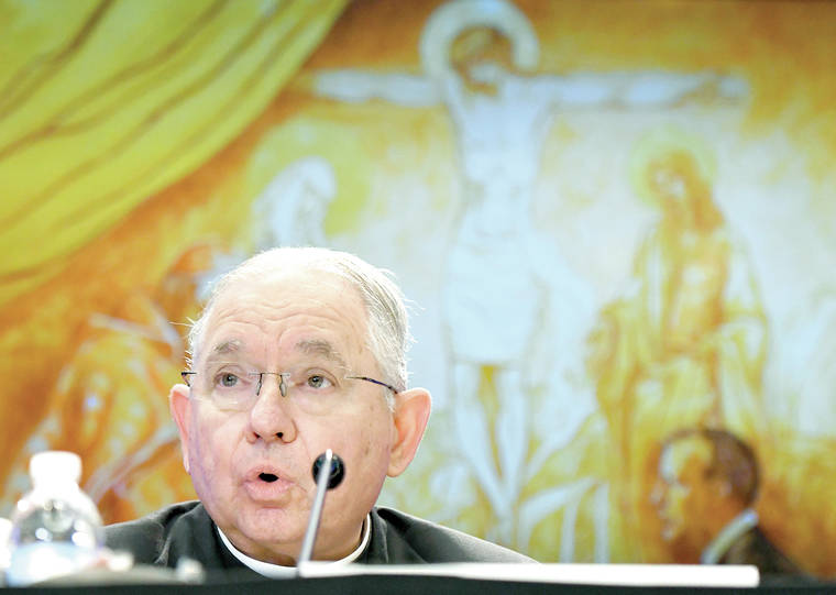 Archbishop Jose H. Gomez, of Los Angeles, speaks during a news conference after being elected as president of the United States Conference of Catholic Bishops during their Fall General Assembly on Tuesday, Nov. 12, 2019 in Baltimore. (AP Photo/Steve Ruark)