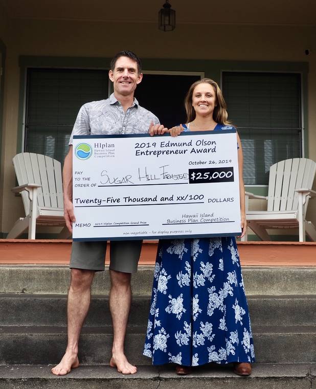 Courtesy Sugar Hill Farmstead Bodhi and Brittany Anderson, owners of Honomu's Sugar Hill Farmstead, pose with the $25,000 Edmund Olson Entrepreneur Award they received last month in the Hawaii Island Business Plan Competition.