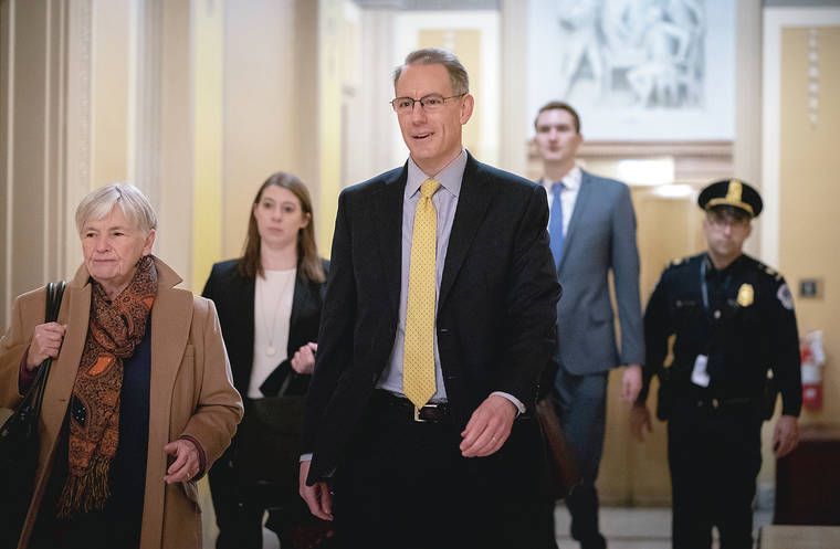 Mark Sandy, a career employee in the White House Office of Management and Budget, arrives at the Capitol on Saturday to testify in the House Democrats' impeachment inquiry. (AP Photo/J. Scott Applewhite)