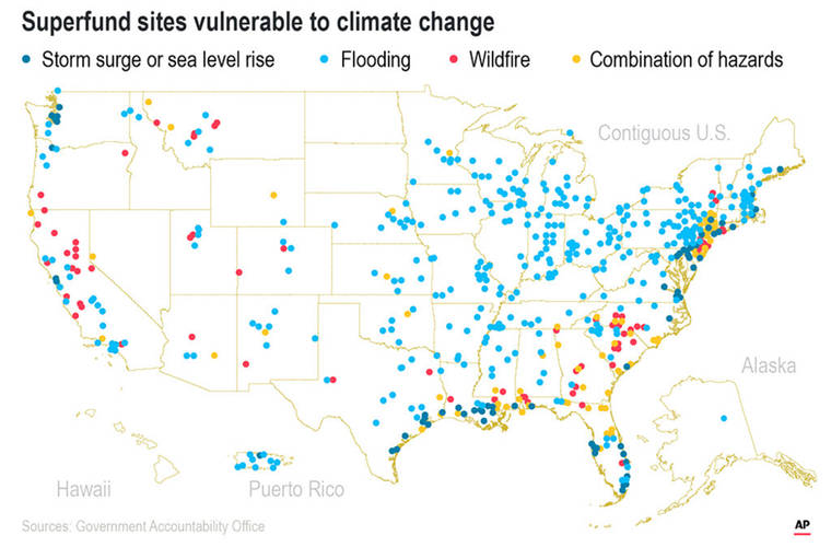 WASHINGTON — The worsening wildfires, floods and hurricanes of climate change threaten at least 60% of U.S. Superfund sites, and efforts to strengthen the hazardous waste sites are stalling in some vulnerable regions as the Trump administration plays down the threat, says a congressional watchdog agency.