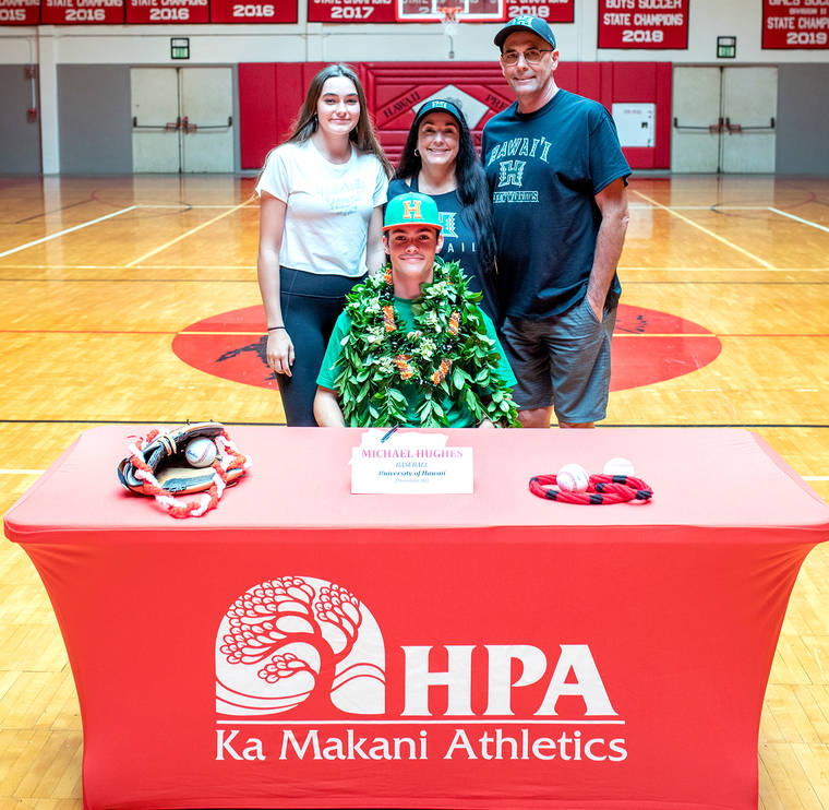 PATRICK O’LEARY photo HPA senior Michael Hughes poses with his family Thursday after signing his letter of intent to play for the University of Hawaii.