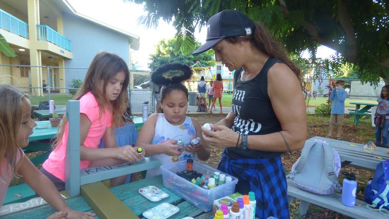 Keiki are painting, raking leaves, planting seeds, harvesting food and weeding small patches of dirt in their garden under the watchful eye of Leah Winkler.