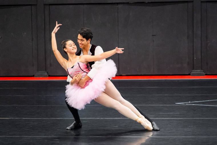 Photo by Raiatea Arcuri Kassidy Wilson and Kaʻeo Cachola as the young adult David Kalakaua and Lydia Kamakaʻeha in the pas de deux.