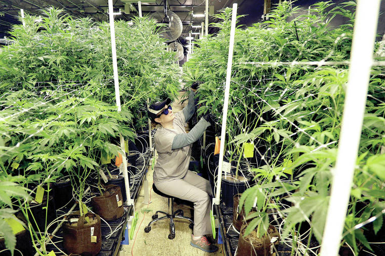 FILE - In this March 22, 2019, file photo, Heather Randazzo, a grow employee at Compassionate Care Foundation’s medical marijuana dispensary, trims leaves off marijuana plants in the company’s grow house in Egg Harbor Township, N.J. The U.S. government is explicitly barring federal dollars for opioid addiction treatment from being used on medical marijuana. (AP Photo/Julio Cortez, File)