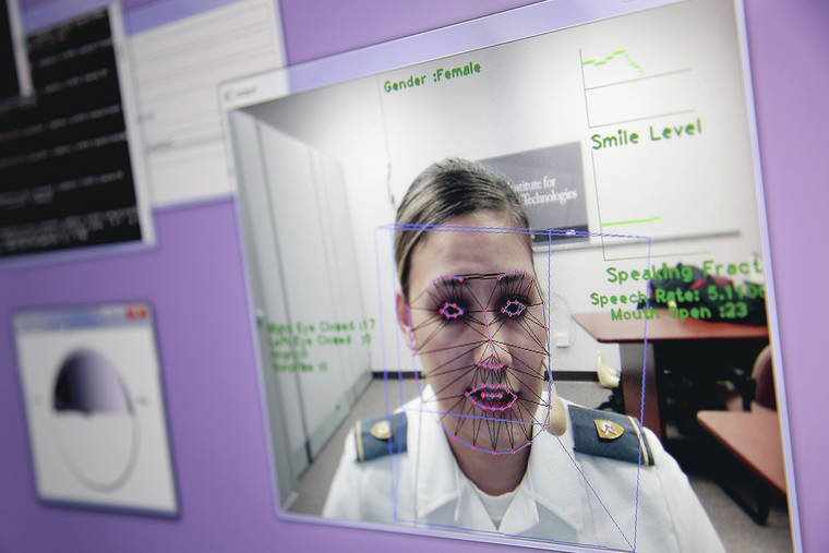A computer monitors some of Cadet Cheyenne Quilter's reactions as she works with a virtual reality character named "Ellie" on May 2 at the U.S. Military Academy at West Point, N.Y. (AP Photo/Seth Wenig, File)
