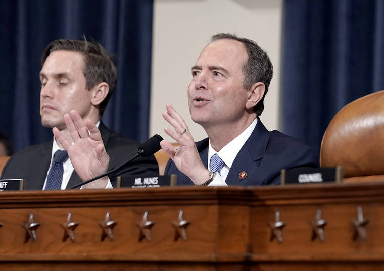 House Intelligence Committee Chairman Adam Schiff, D-Calif., with committee staffer Daniel Noble at left, makes impassioned remarks Thursday on Capitol Hill in Washington. (AP Photo/J. Scott Applewhite)