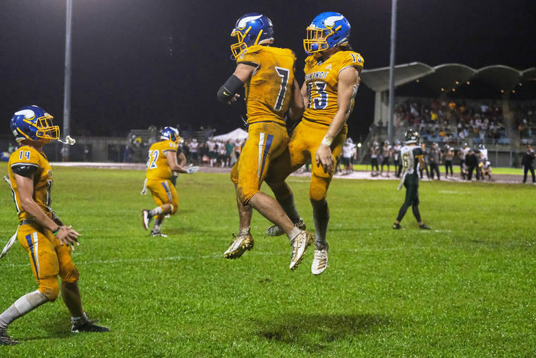 Poi Dog photography Hilo's Kilohana Haasenritter, left, and Kaimi Tiogangco celebrate last Saturday during the Vikings' 19-9 win against Leilehua in the HHSAA Division I semifinals.