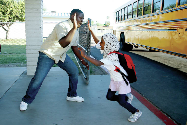 Samuel Lavi, left, a Congolese native who is a teaching assistant and family engagement liaison, greets first grader Kediga Ahmed as she arrives at the Valencia Newcomer School attend class Thursday, Oct. 17, 2019, in Phoenix. Children from around the world are learning the English skills and American classroom customs they need to succeed at so-called newcomer schools. Valencia Newcomer School in Phoenix is among a handful of such public schools in the United States dedicated exclusively to helping some of the thousands of children who arrive in the country annually. (AP Photo/Ross D. Franklin)