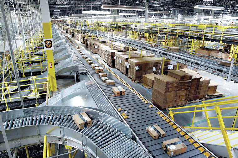 FILE- In this Aug. 3, 2017, file photo, packages ride on a conveyor system at an Amazon fulfillment center in Baltimore. Amazon, Walmart and others are promising to deliver more of their goods in a day and this holiday season will be the first real test of whether they can make that happen. (AP Photo/Patrick Semansky, File)