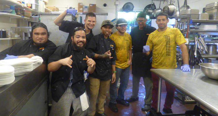 The kitchen staff at Jackie Rey's Ohana Grill pose Thursday while working on the restaurant's annual free Thanksgiving meal. (Elizabeth Pitts/West Hawaii Today)