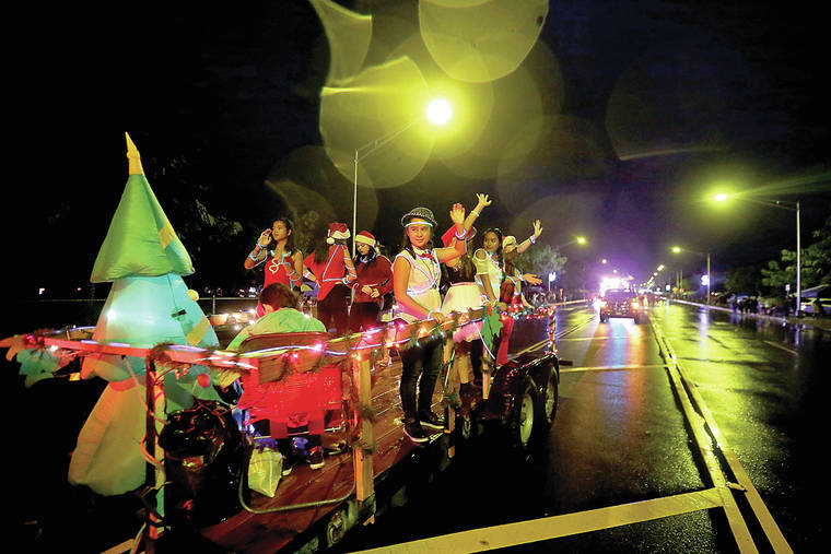 Tribune-Herald file photo Students from Hilo High School Performing Arts Learning Center wave in the rain during the 2017 Hilo Christmas Light Parade.