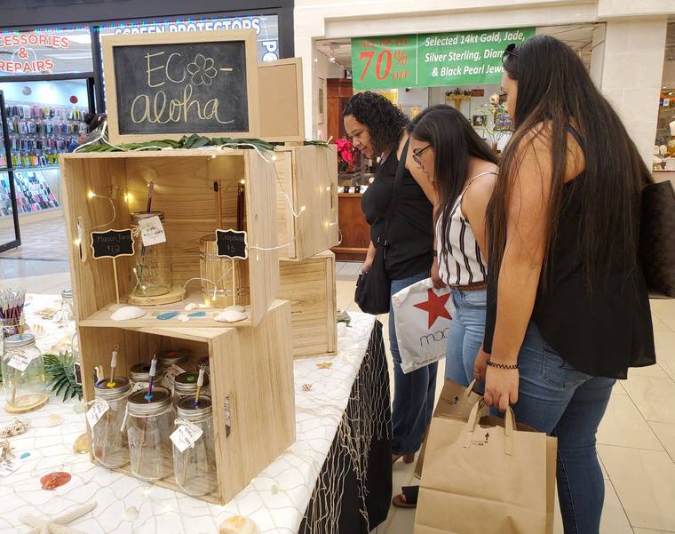 Tacoma Wela, a 15-year-old student at Kamehameha Schools, was with Eco-Aloha, a company sponsored by HFS Federal Credit Union, that sold reusable glass Mason jars etched with the company name and a reusable straw and straw cleaner, as well as reusable wooden chopsticks.