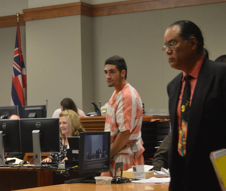 JOHN BURNETT/Tribune-Herald Jaggar Dunne-Torres leaves Hilo District Court Friday. At right is his court-appointed defense attorney, Stanton Oshiro.