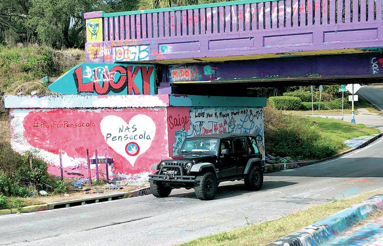 A vehicle drives by a tribute to victims of the Naval Air Station Pensacola that was freshly painted on what’s known as Graffiti Bridge in downtown Pensacola, Fla., on Saturday, Dec. 7, 2019. A US official says the Saudi student who fatally shot three people at the Florida naval base had hosted a dinner party earlier in the week to watch videos of mass shootings. The official spoke on condition of anonymity after being briefed by federal investigators. The official says a second Saudi student was recording outside the building at the Naval Air Station Pensacola on Friday while the shooting was happening inside. The official also says 10 Saudi students are being held at the base and that several others are unaccounted for. (AP Photo/Brendan Farrington)