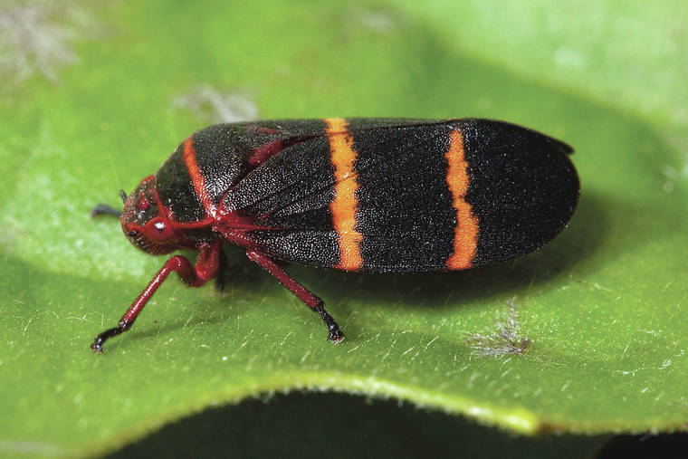 An adult two-lined spittle bug. Both adult and nymph forms feed on plants by sucking out nutrients. (Photo: Big Island Invasive Species Committee)