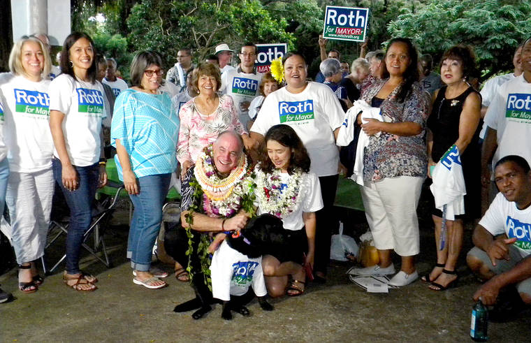 Roth, 55, standing amid his old prosecutor campaign signs with the word “mayor” slapped in red over “prosecutor,” and cheered on by more than 100 supporters wearing new campaign T-shirts, made his announcement Tuesday at Liliuokalani Gardens.