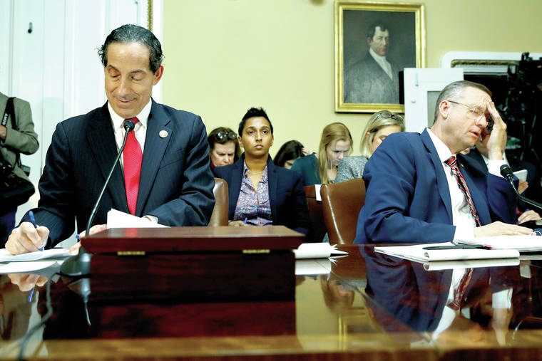 Rep. Jamie Raskin, D-Md., and House Judiciary Committee ranking member Rep. Doug Collins, R-Ga., during a House Rules Committee hearing on the impeachment against President Donald Trump, Tuesday, Dec. 17, 2019, on Capitol Hill in Washington. (AP Photo/Patrick Semansky, Pool)